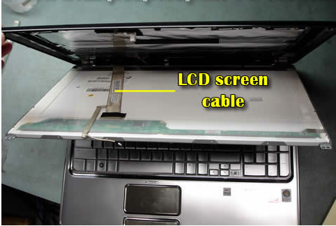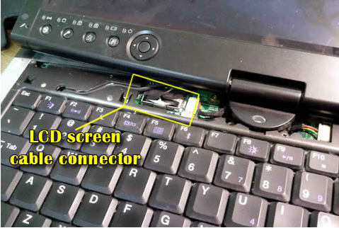Layar laptop menerima sinyal data dari motherboard melalui kabel LCD. Jika kabel LCD tidak berfungsi normal pada motherboard, akan terjadi distorsi warna pada layar. Coba lepas kabel konektor LCD dan pasang kembali dengan baik dan lihat perubahannya. Pastikan konektor LCD kabel terpasang dengan benar.Pada kebanyakan laptop, kabel konektor LCD terletak di bawah keyboard bezel (penutup keyboard), ada juga yang letaknya dibawah keyboard.