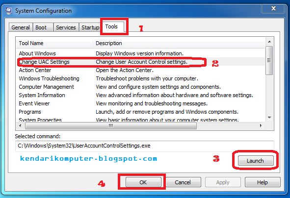 Kemudian tampil jendela seperti pada gambar dibawah ini, pilih tab Tools lalu pilih Change UAC Settings, lalu klik Launch.