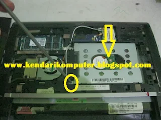 Nah, setelah caching terbuka tampaklah Hardisk dan RAM, lepaskan baut hardisk. Langkah ini juga dilakukan untuk melepas RAM netbook.