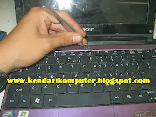 Gunakan pinset untuk melepas keyboard netbook anda, lihat pada gambar, lepaskan pengancing keyboard dengan cara menekan kedalam dan mencungkil naik keyboard.