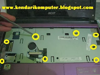 Lepaskan semua baut seperti pada gambar, baut pada bawah keyboard inilah yang membuat rumit untuk kita melepas dan mengganti hardisk pada netbook acer seperti ini, baut ini terlebih dahulu harus dilepaskan agar caching bagian bawah dapat terbuka, yang merupakan akses untuk melepas hardisk.