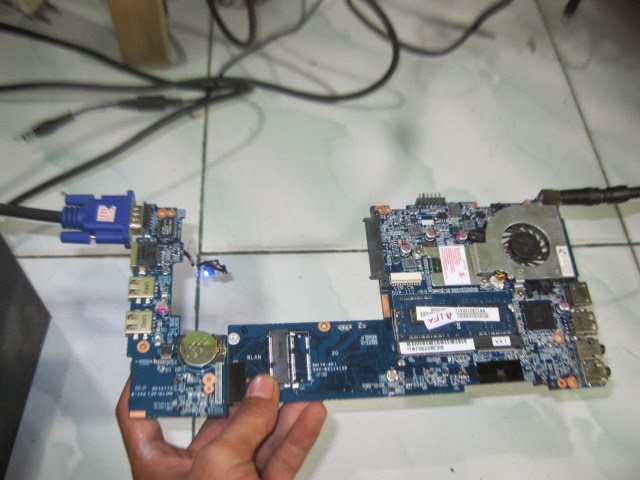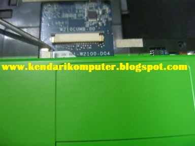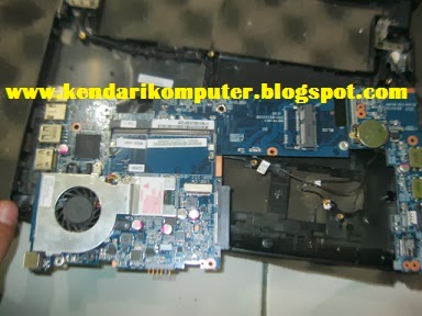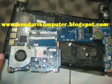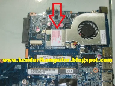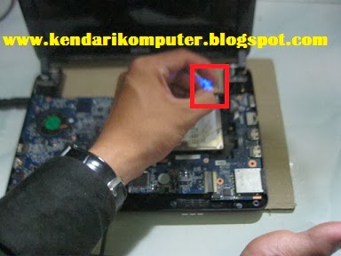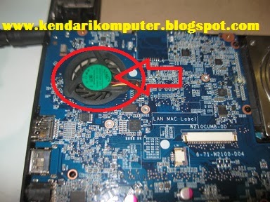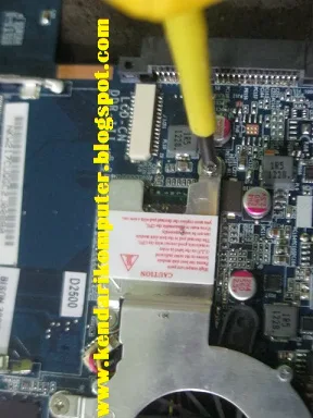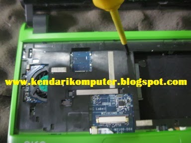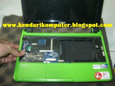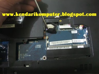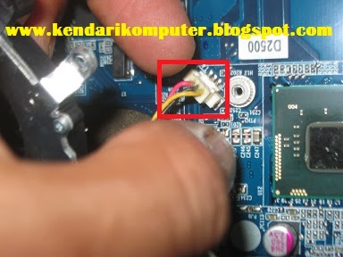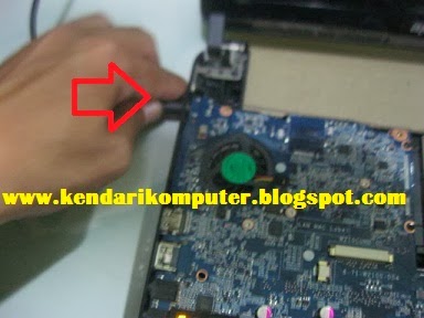 Setelah itu saya membuka caching atas netbook dan melepas semua baut pada maiboard, kemudian saya balik posisi mainboard untuk menjangkau kipas processor, kemudian saya melepas kabel connetor kipas, lihat pada gambar di atas.