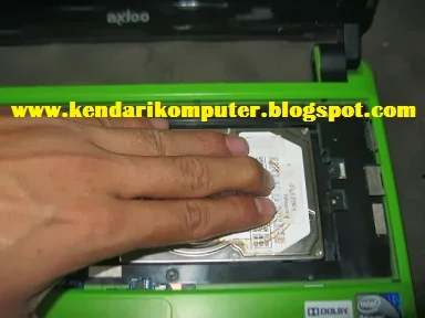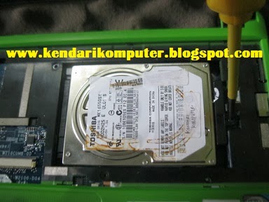 Selanjutnya setelah saya melepakan keyboard tampak dibawah keyboard terdapat hardisk, lepaskan baut penganjal pada hardisk dan kemudian lepaskan hardisk dengan cara mendorong keluar dari connectornya.