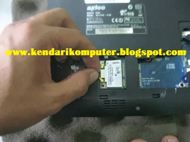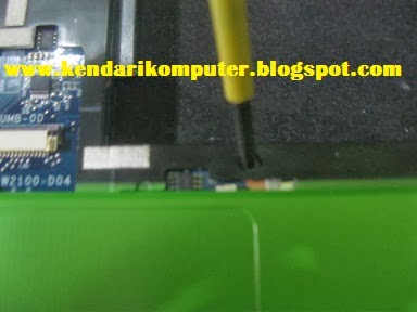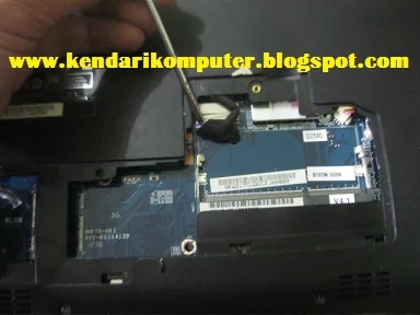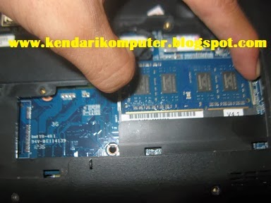 Kemudian saya melepas memori RAM dengan cara menekan keluar secara bersamaan pengancing pada sisi kanan dan kira RAM, saya juga melepas Wifi Card dan Connetor Layar. Lihat gambar di atas.