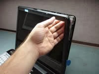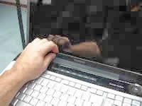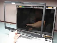 Nah perhatikan ada baut pada sudut sudut layar anda, buka dan tahan layar jangan sampai jatuh, setelah itu lepaskan kabel flexible yang terhubung ke layar pada bagian belakang lakukan dengan hati hati, karena jangan sampai anda merusak flexiblenya.