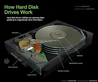 Hardisk (HDD) bekerja dengan menggunakan prinsip magnetisasi untuk menyimpan data pada plat besi dan membacanya menggunakan kepala baca/tulis.