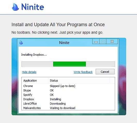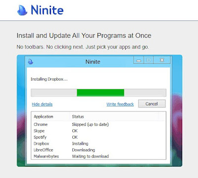 Ninite adalah sebuah layanan online yang memungkinkan pengguna untuk menginstal banyak program sekaligus di PC atau laptop dengan cepat dan mudah. Dengan menggunakan Ninite, pengguna tidak perlu lagi mendownload installer program satu per satu dan melakukan proses instalasi secara manual. Semua proses itu dapat dilakukan dalam satu langkah instalasi yang mudah dan cepat.