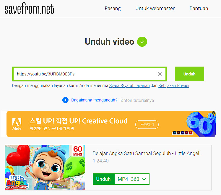 ke dalam kolom unduh di aplikasi SaveFrom. Setelah tautan video Youtube